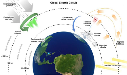 Quasi direct-current (DC) and alternating current (AC) electrodynamic processes predominantly originating from active thunderstorms form a globally coupled network of electric currents and electromagnetic (EM) radiation fields in the near-Earth environment. The part of this system that occupies the atmosphere below c.a. 100 km altitude, also including the bottom of the Earth’s ionosphere, is referred to as the atmospheric global electric circuit (GEC). We study the characteristics and dynamics of thunderstorms on a global scale via investigating the distribution and intensity of the lightning activity which is one of the officially accepted key climate parameters. Our studies are based on monitoring various elements of GEC. The set of studied elements includes the parameters and variations of the DC electric field and currents between the Earth’s surface and the ionosphere; the production (primarily by lightning) and propagation of extremely low frequency (ELF, here 3 Hz to 3 kHz) EM waves in the EM waveguide enclosed by the ground and the lower ionosphere (with an emphasis on Schumann resonances (SR), i.e.global EM resonances in the closed waveguide); and the transient luminous events (TLEs), e.g., red sprites, blue jets. The primary aim of the corresponding investigations is to explore and evaluate the potential of monitoring atmospheric electrodynamic processes in characterizing the energy transport between the near-Earth space environment and the Earth’s surface and in indicating as well as possibly altering the properties of EM radiation and atmospheric composition in the different layers of the atmosphere.