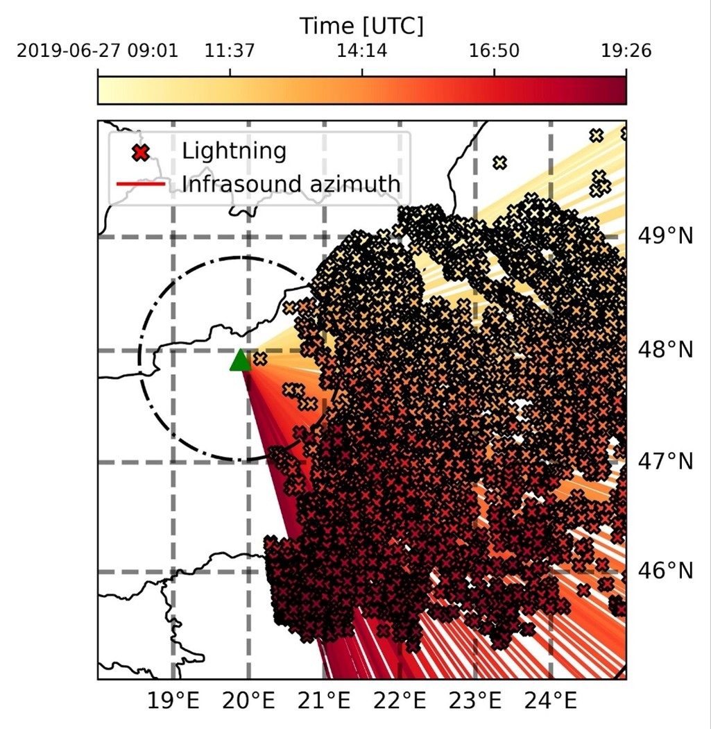 Low frequency (typically 0.01-20 Hz) acoustic signals propagating through the atmosphere are also known as infrasound. As the association of such signals to their sources (e.g., to lightning activity) usually requires ground truth information, a method which relies on the correlation of lightning distribution and infrasound detections is routinely utilised. Near (<50 km) to the Hungarian infrasound array (Piszkés-tető) we are also able to recognise individual lightning strokes in the pressure records.