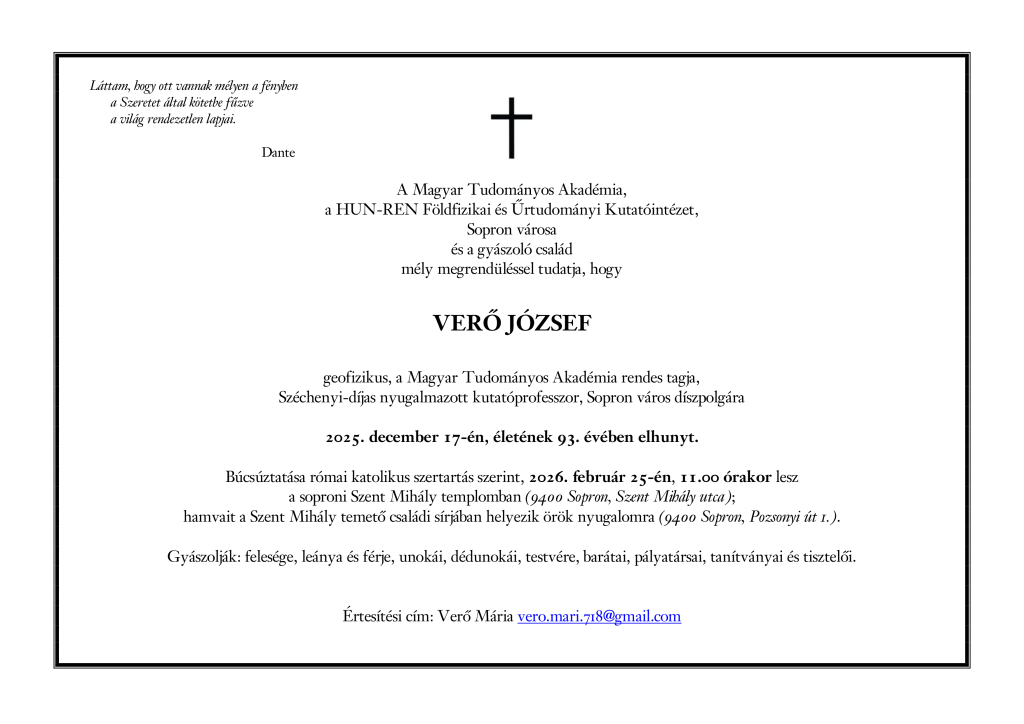 92 éves korában elhunyt Verő József Széchenyi-díjas geofizikus kutató professzor,